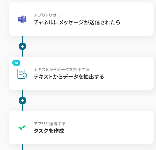 1.はじめに、Microsoft TeamsとWrikeをYoomと連携します。 2.次に、トリガーでMicrosoft Teamsを選択し、「チャネルにメッセージが送信されたら」というアクションを設定します。 3.次に、オペレーションで「テキストからデータを抽出する」を設定し、Microsoft Teamsの投稿内容からタスクに必要な情報を取り出します。 4.最後に、オペレーションでWrikeの「タスクを作成」アクションを設定し、抽出した情報を元に新しいタスクを作成します。 ※「トリガー」:フロー起動のきっかけとなるアクション、「オペレーション」:トリガー起動後、フロー内で処理を行うアクション