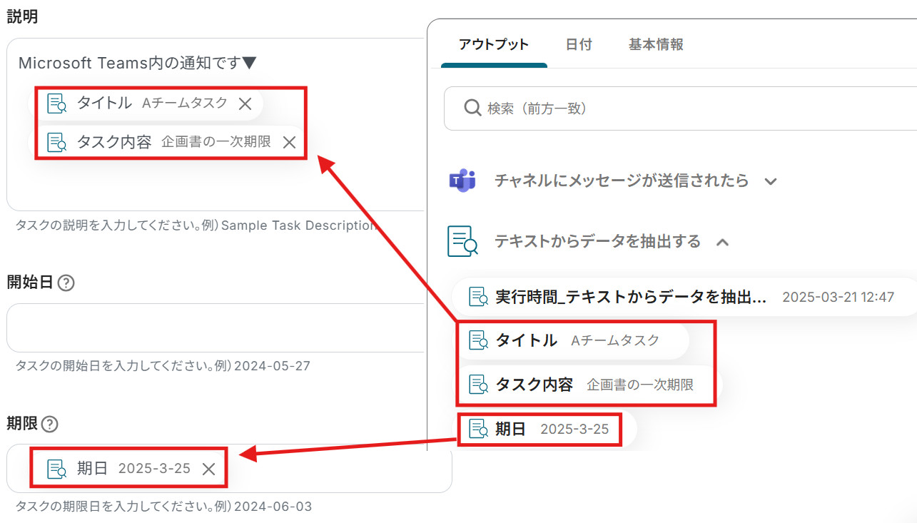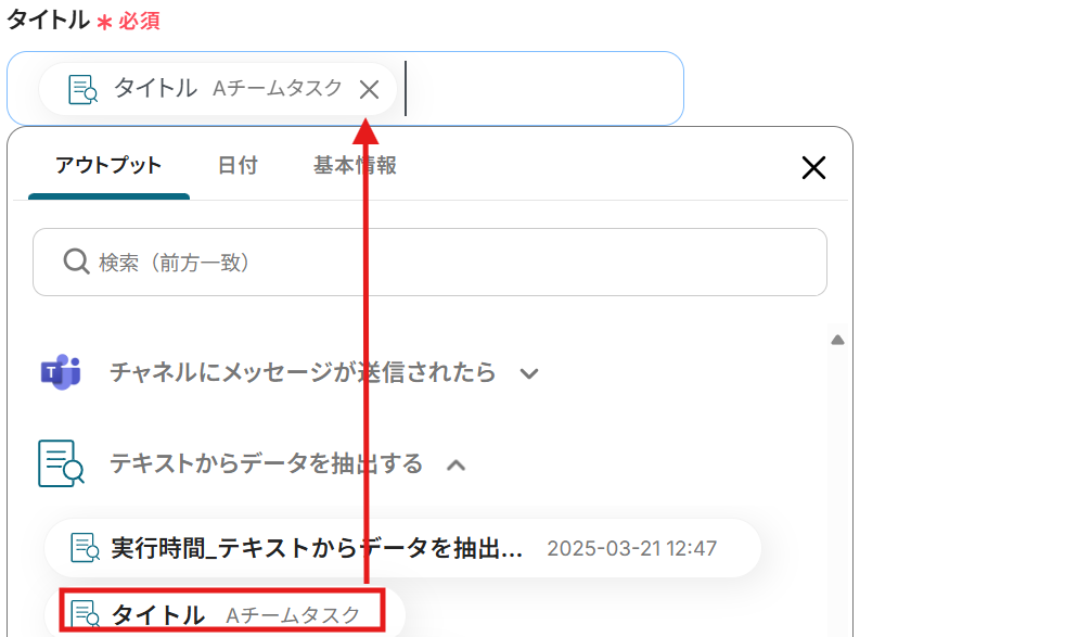※「アウトプット(取得した値)」から選択した項目は赤枠のように表示されます。 値を引用している印なので、これによってトリガーで取得した値をそのまま利用できます。 ここに手入力でテキストを設定してしまうと、フロー起動時に毎回そのテキストの抽出結果が出てしまうので「アウトプット(取得した値)」から必ず選択してください。