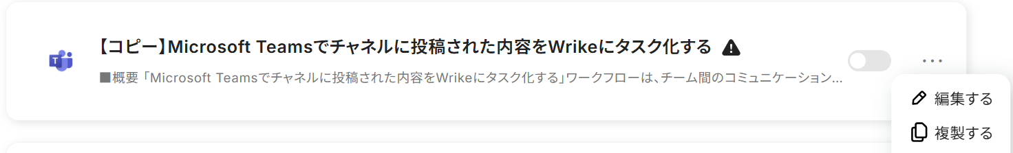 以下の画像が表示されたら、トリガーをONにしてください。 これですべての設定が完了したので、Microsoft Teamsでチャネルに投稿された内容がWrikeにタスク化されるかを確認してみましょう。