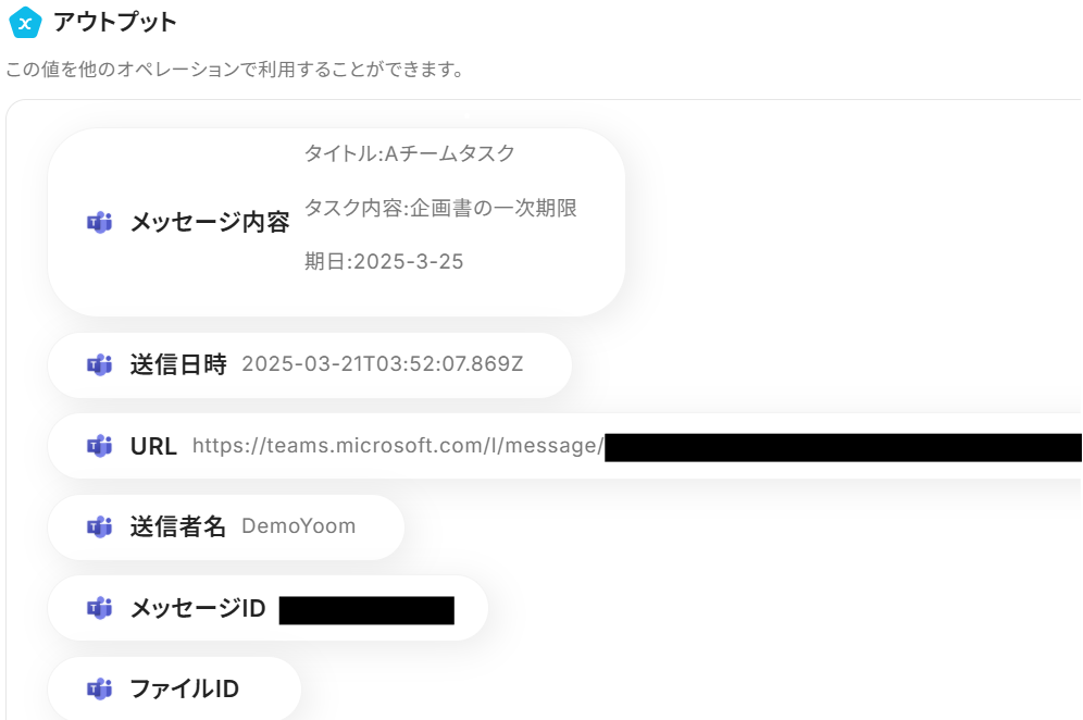 フローボットに戻り、テストをクリックしましょう。 正しく連携できていると、画面下部のアウトプットにメッセージ内容が表示されます。 この「アウトプット(取得した値)」をこのあとのアクション設定時に引用することで、Microsoft TeamsとWrikeのデータ連携を実現していきます! ここまでできたら保存しましょう。