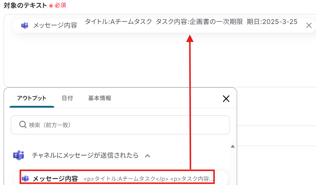 対象のテキスト :フォームのアウトプット「チャネルにメッセージが送信されたら 」から選択します。