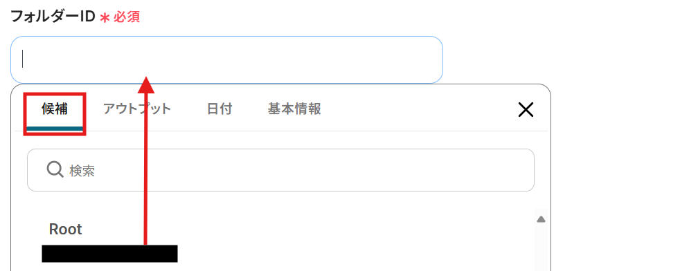 フォルダID :該当欄をクリックすると表示される候補から選択してください。