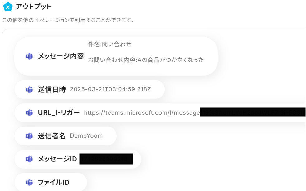 このアウトプットをこのあとのアクション設定時に引用することで、Microsoft TeamsとZendeskのデータ連携を実現していきます!
