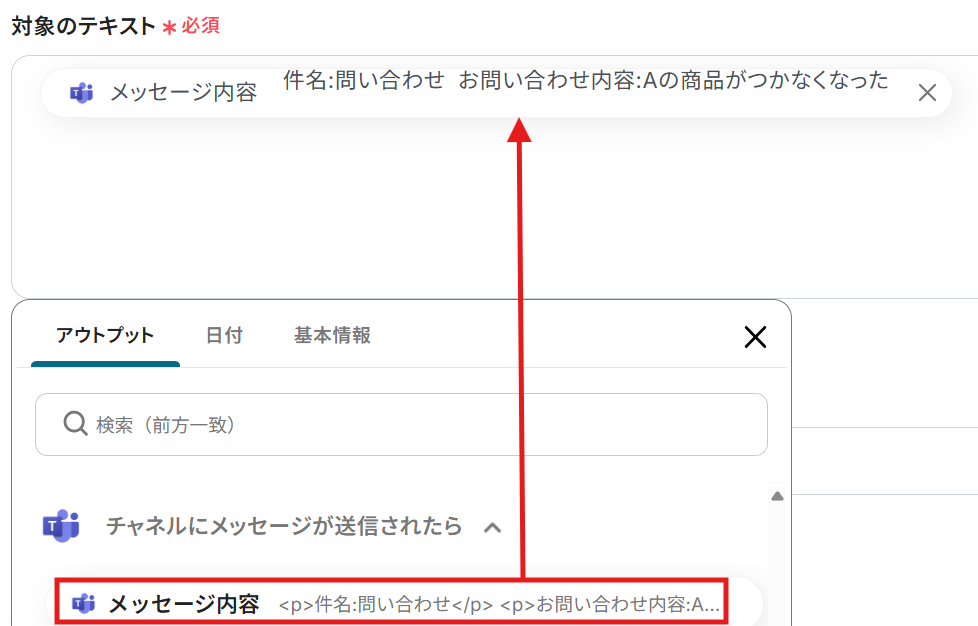 対象のテキスト:フォームのアウトプット「チャネルにメッセージが送信されたら」から選択します。