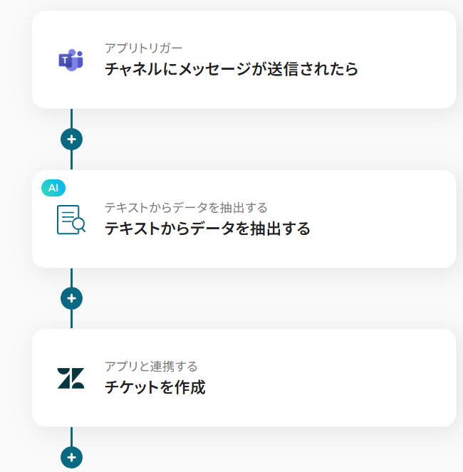 このワークフローを活用すれば、Microsoft Teamsへの投稿をきっかけに、投稿内容からAIが情報を抽出しZendeskへ自動でチケットを作成できます。