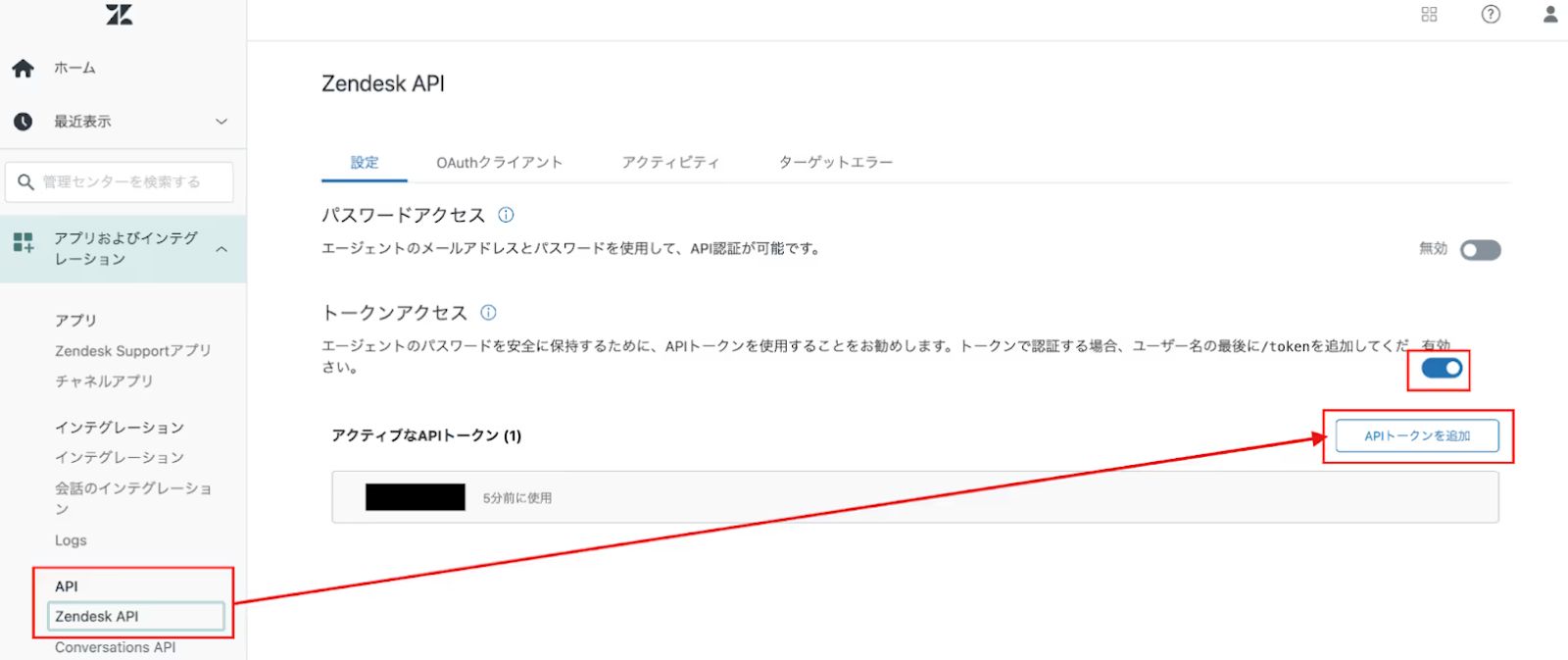 APIはZendeskの以下の画面から確認できます。