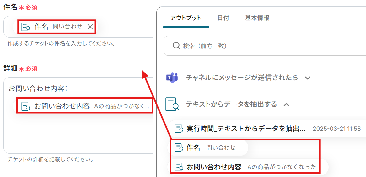 件名・詳細:先ほど取得したアウトプットを利用して設定してください。