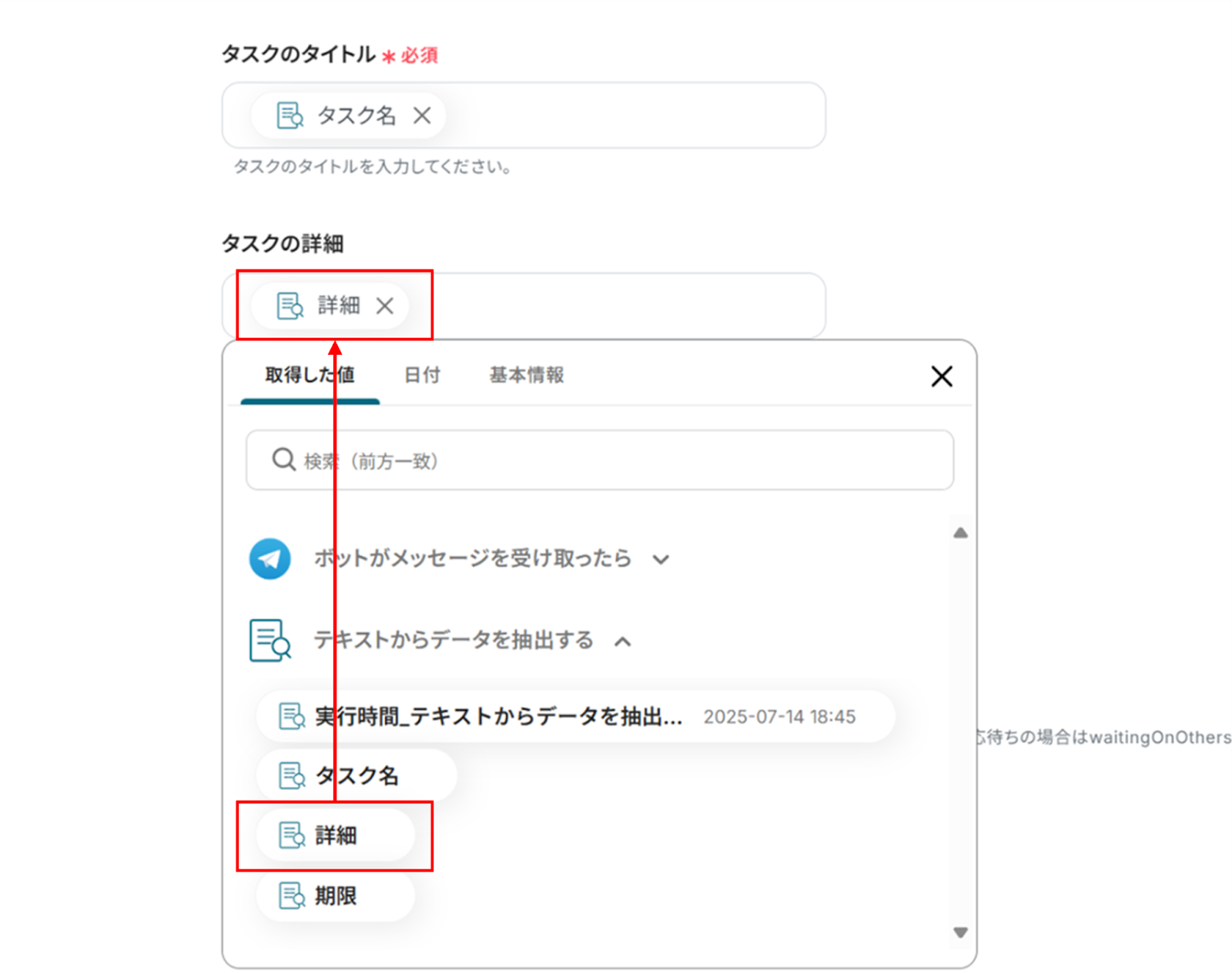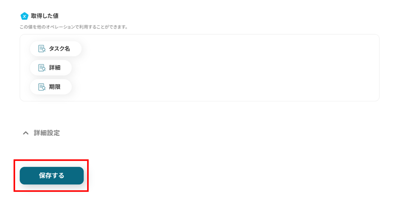 - 対象のテキスト:先ほど取得した値を使って入力します。