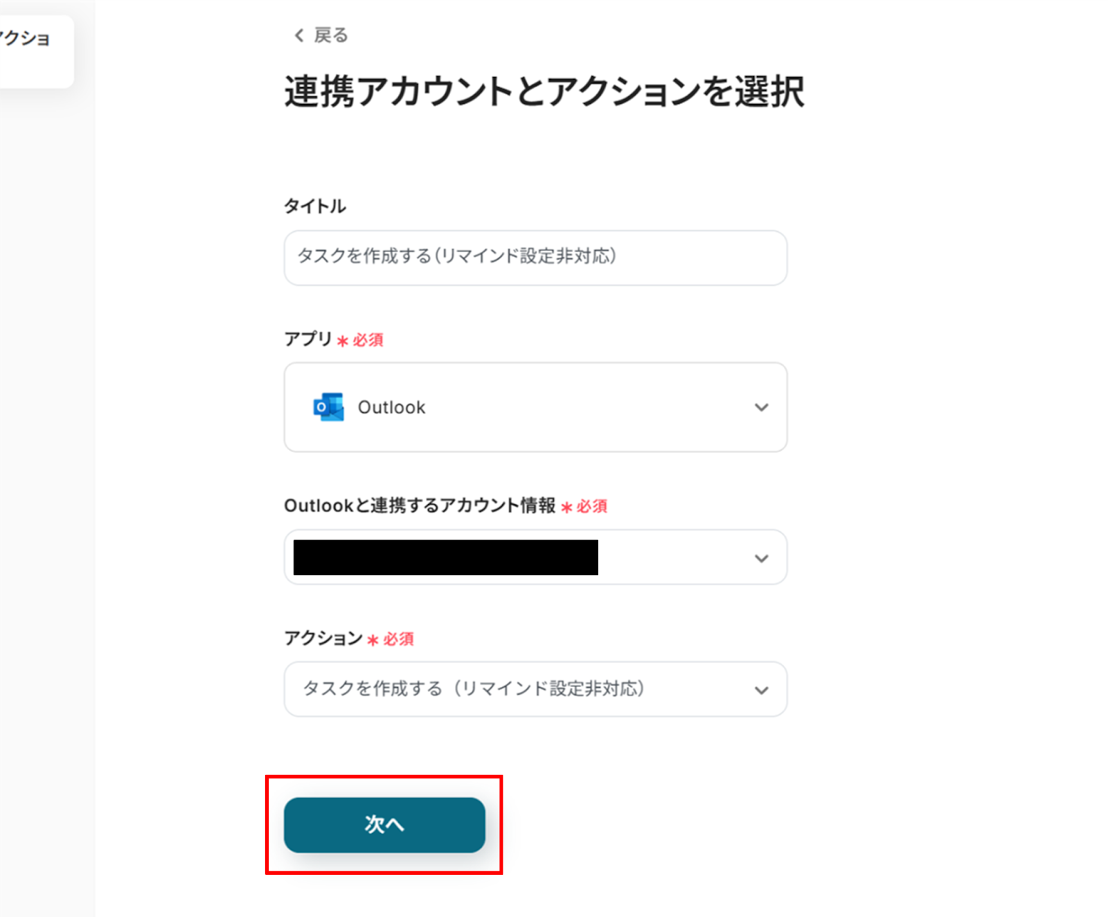 (2)「連携アカウントとアクションを選択」画面から、Outlookと連携するアカウント情報に誤りがないかを確認し、アクションは「タスクを作成する」のままで「次へ」をクリックします。