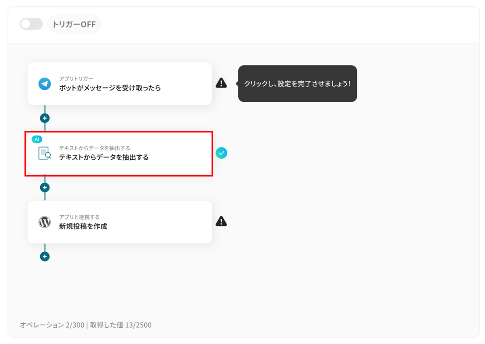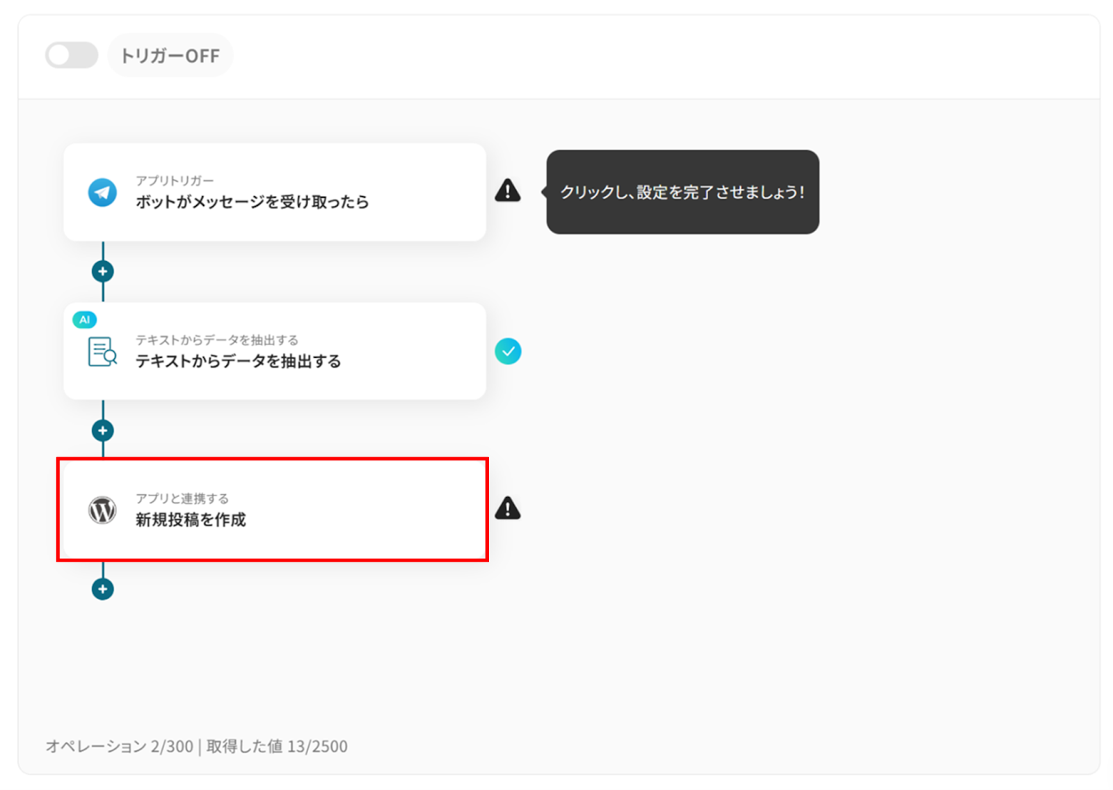 今回は「Telegramで投稿があったら、WordPressに新規投稿を作成する」フローを作成していきます!