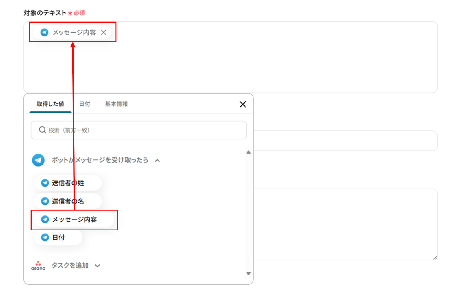 タイトルやコンテンツの項目で取得した値を使うことで、都度変更することなくTelegramの情報を引用することができます!