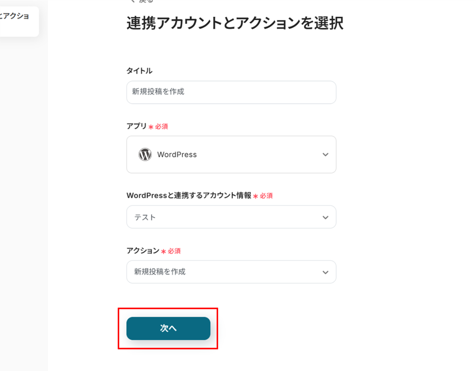 (2)「連携アカウントとアクションを選択」画面から、WordPressと連携するアカウント情報に誤りがないかを確認し、アクションは「新規投稿を作成」のままで「次へ」をクリックします。