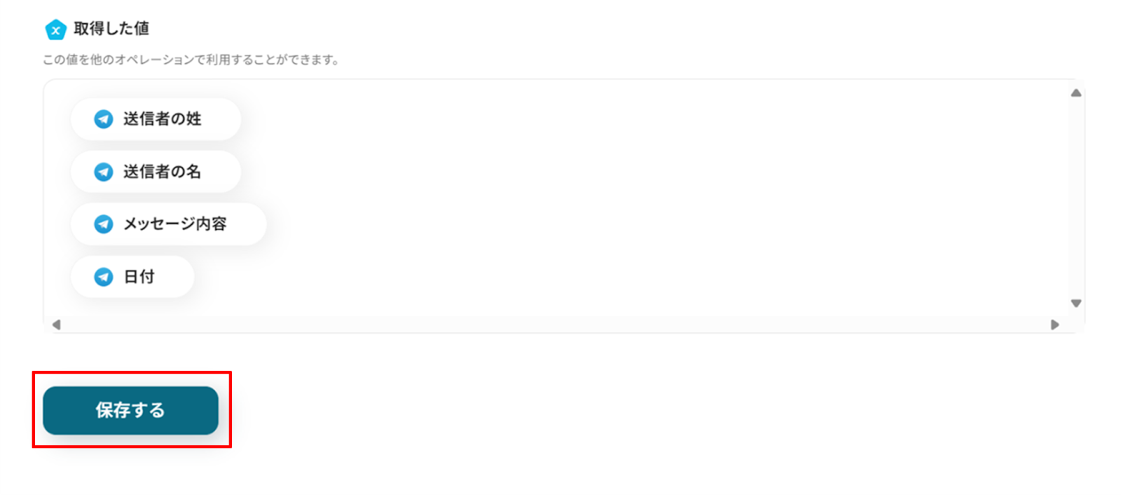 「取得した値」にTelegramの情報が反映されればテスト成功です。
