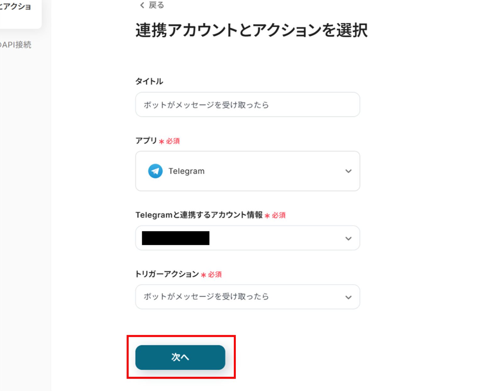 (2)「連携アカウントとアクションを選択」画面から、Telegramと連携するアカウント情報に誤りがないかを確認し、トリガーアクションは「ボットがメッセージを受け取ったら」のままで「次へ」をクリックします。