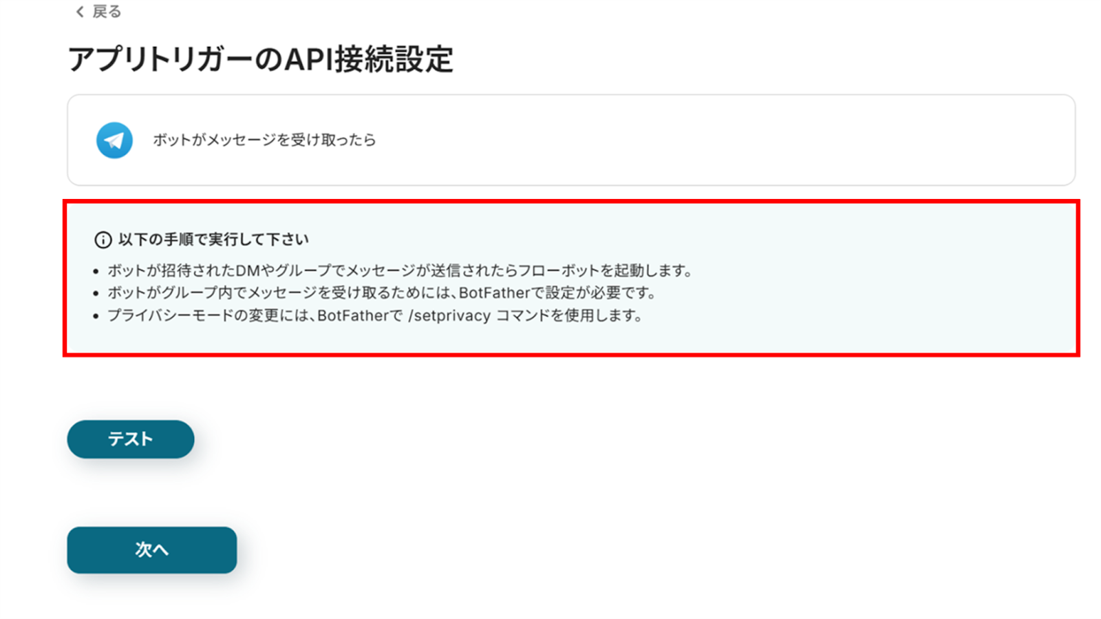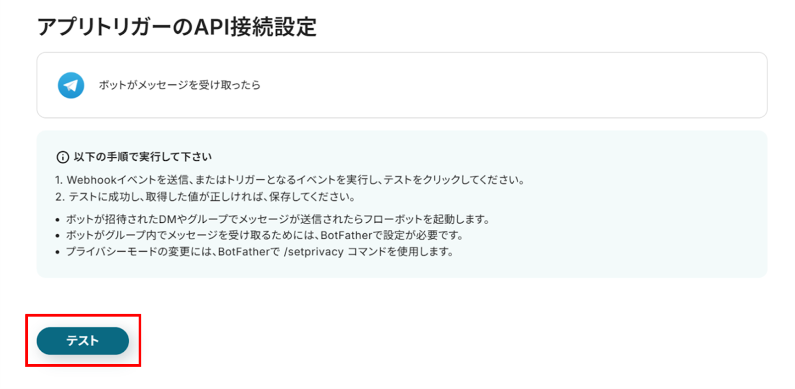 (3)「アプリトリガーのAPI接続設定」画面から赤枠を確認の上、Telegramにテストメッセージを送信しましょう!