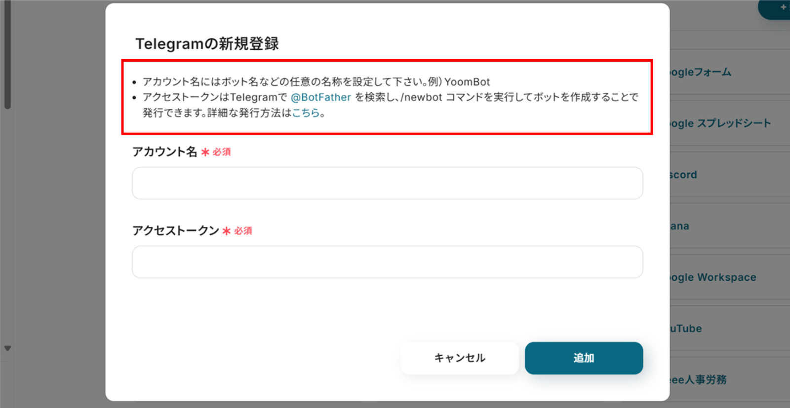 (2)「Telegramの新規登録」画面から赤枠を確認の上、アカウント名、アクセストークンを入力します。