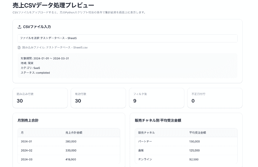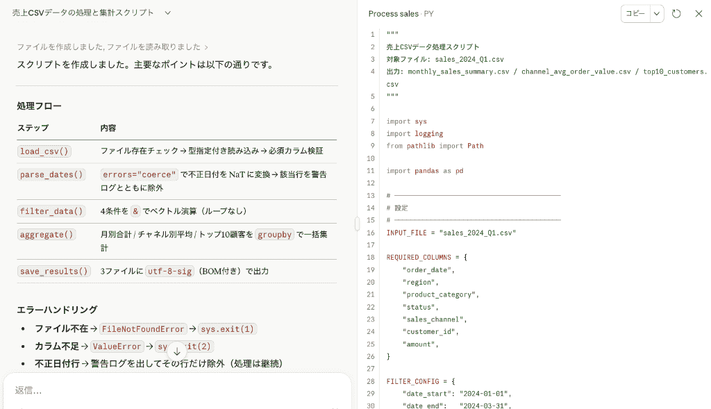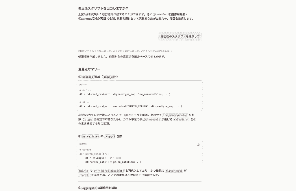 指示した通り、Pandasライブラリを活用した効率的で可読性の高いコードで、実際に実装して動作を確認したところ問題なく動いてくれました!