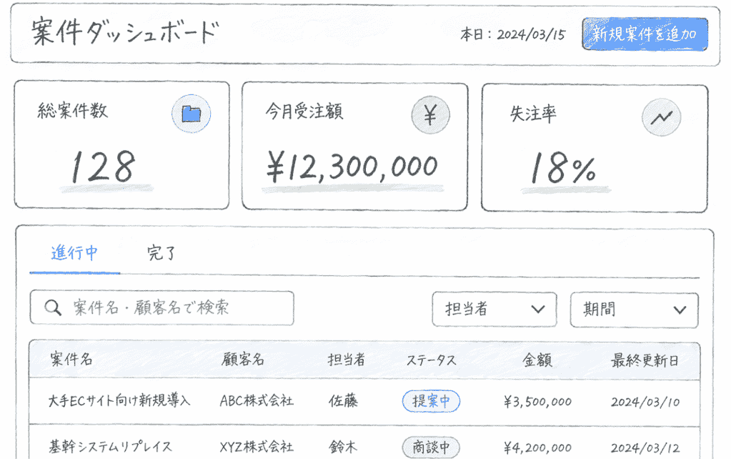 ・画面上部: ・左にタイトル「案件ダッシュボード」