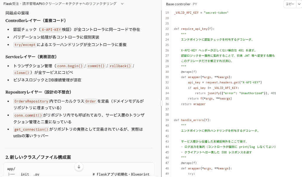 関連する全てのソースコードを一度に読み込ませた上で、共通処理の切り出しとクラス設計の見直しを指示します。