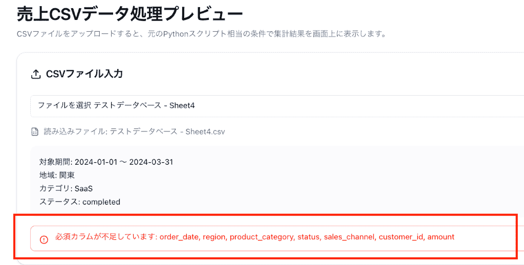 ちなみに対象カラムが含まれていないCSVデータもアップロードしてみましたが、しっかりとエラーとして検知してくれましたよ!