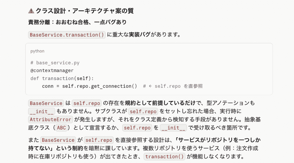 なお、クラス設計・アーキテクチャ案の質に関しては、実装バグが一点含まれていたので、一度の生成では完璧なコード生成は難しいなという印象です。