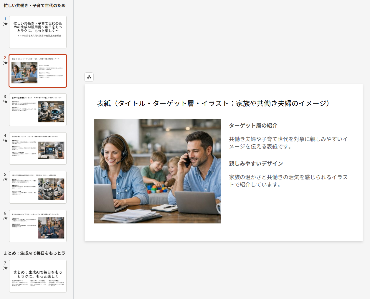 現在開いているこの自社テンプレートのデザインとレイアウト規則を維持したまま、「日常での生成AIの活用術」に関するプレゼンテーションを作成してください。 全体は5スライド構成(表紙と最後のスライドを含む)とし、2〜4ページのスライドには、内容に適したイラストを入れてください。 ターゲットは忙しい共働き夫婦・子育て世代です。 生成AIの基本情報、利用のメリット、活用事例の3つの要素を必ず含めてください。 地域のコミュニティセンターで行われる勉強会での発表に適した親しみのあるトーンで文章を作成してください。