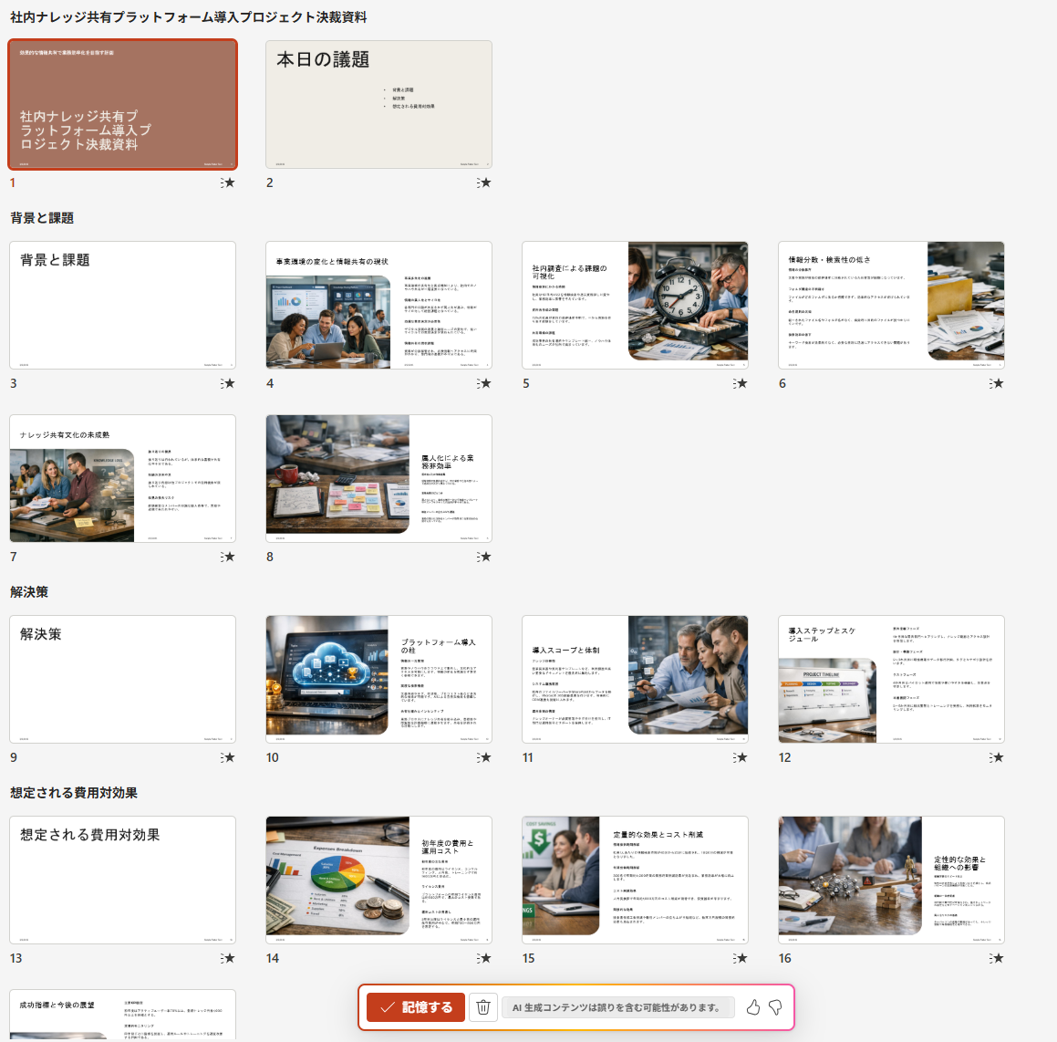 参照したWordの企画書(リンク)の内容をもとに、社内決裁用のプレゼンテーション資料を作成してください。各スライドのテキストは、読みやすさを重視して長くても3行程度の簡潔な箇条書きに要約してください。また、プロジェクトの「背景と課題」「解決策」「想定される費用対効果」の3つのセクションが明確に伝わるようにスライドを分割し、内容に関連するビジネス向けの画像を各スライドに1枚ずつ配置してください。
