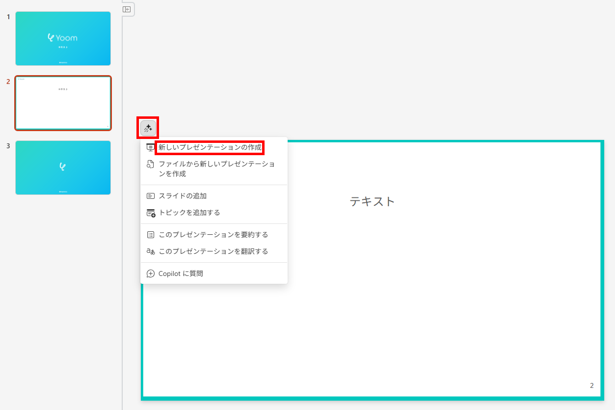 Create a new presentation with Copilot in PowerPoint - Microsoft Support /Copilot tutorial: Create a presentation with a prompt - Microsoft Support /Copilot in PowerPoint for mobile devices - Microsoft Support /AI PowerPoint プレゼンテーション ジェネレーター | Microsoft Copilot /How to Use Copilot in PowerPoint | Microsoft 365 /What is Microsoft 365 Copilot? /Microsoft 365 Copilot - Service Descriptions /Build effective presentations with AI - Training | Microsoft Learn /Microsoft 365 Personal、ファミリー、Premium の AI クレジットと制限 /Microsoft 365 Copilot プランと価格 - ビジネス向けの AI