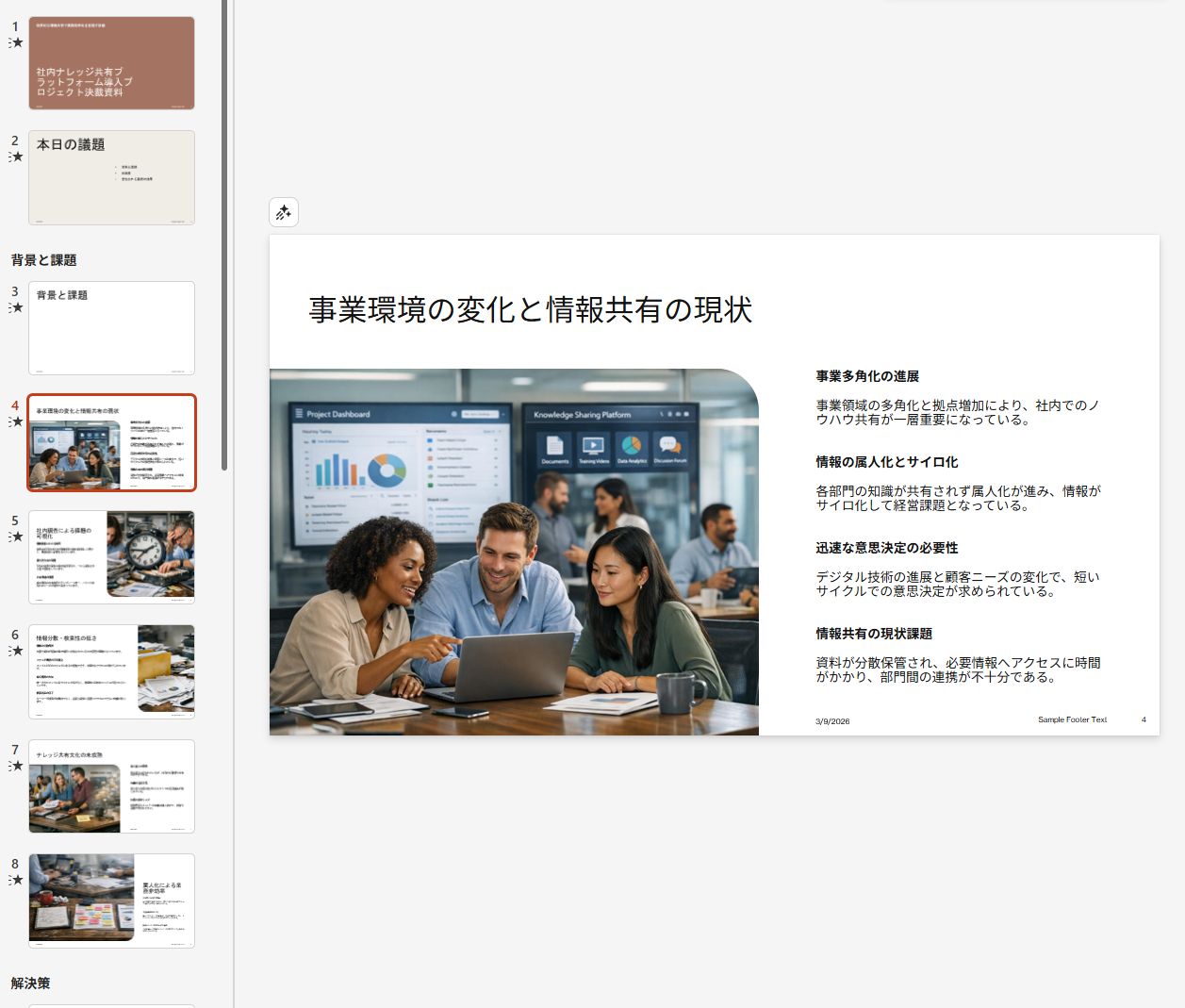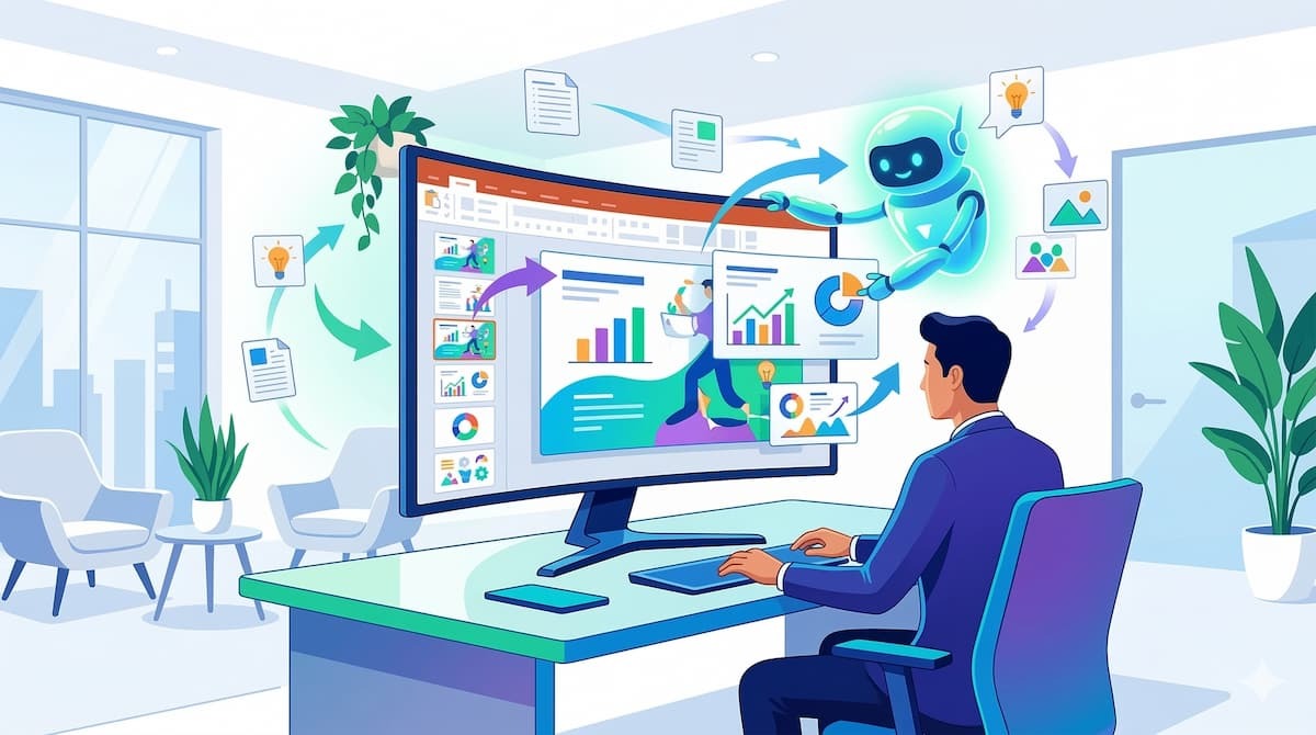 新規スライドの自動生成と構成案の作成 白紙のプレゼンテーションファイルを開き、「新規事業の提案用スライドを作成して」といった簡単なプロンプトを入力するだけで、全体のアジェンダ、各スライドのタイトル、詳細な箇条書きのテキスト、そして内容にマッチした画像を自動的に配置してくれます。ゼロから構成を考えるという最も心理的ハードルの高い作業をAIが代行 してくれるため、生成された「高品質な下書き」をベースに、自社の具体的なデータや独自のアイデアを加筆する作業に集中できるようになります。