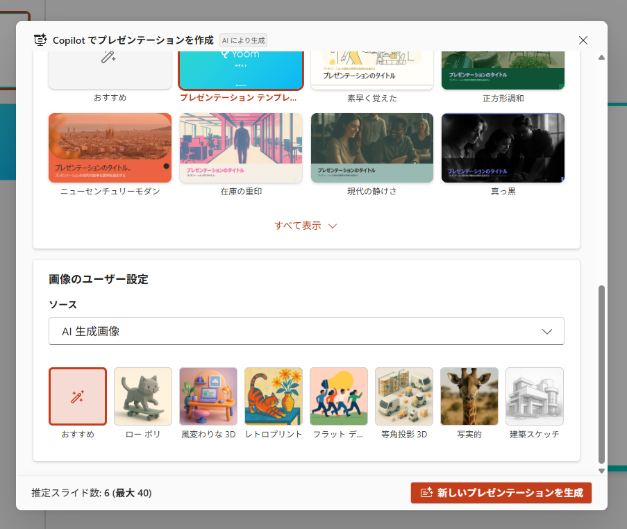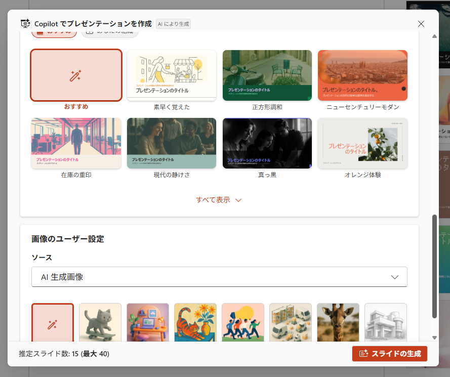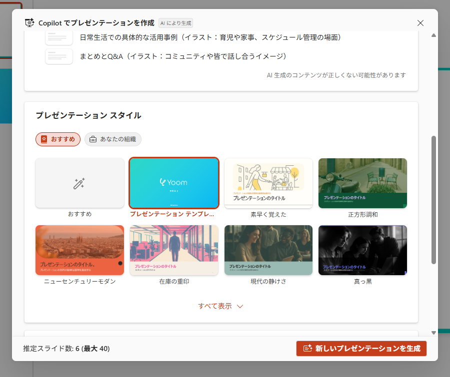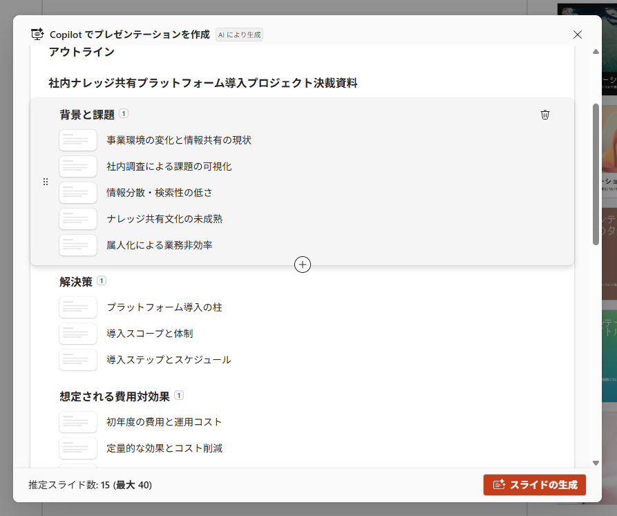 検証結果 上記のプロンプトを送信後、以下のようにアウトラインが作成されました。 検証1と同様に「スタイル」と「画像のユーザー設定」を選択し、スライドを作成しました。