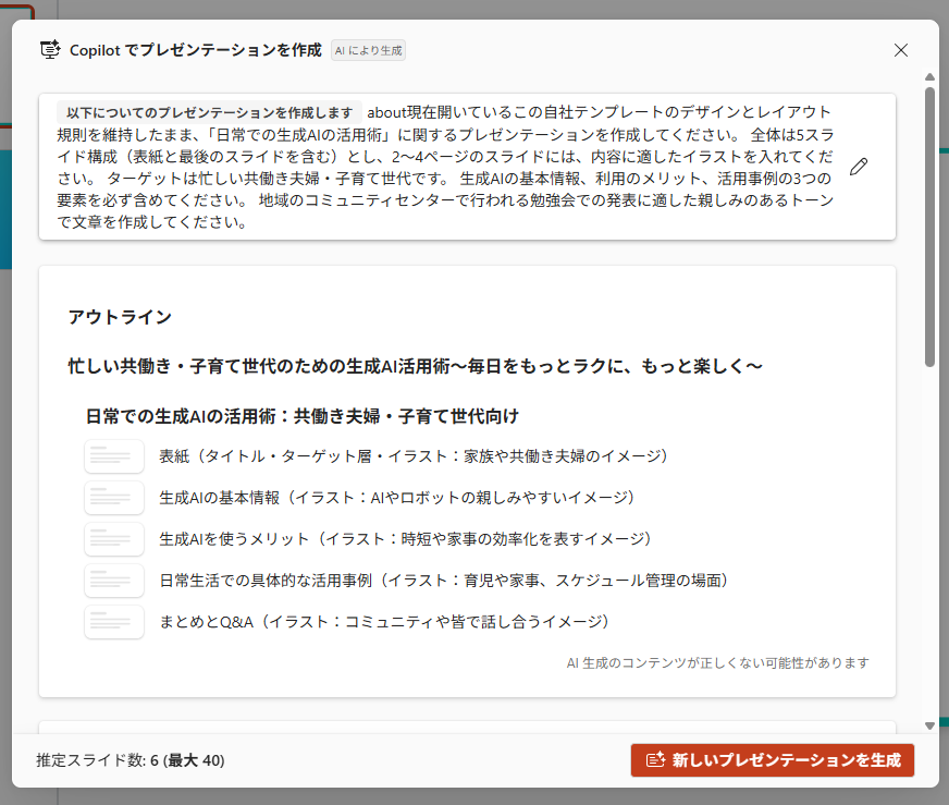 今回は自社テンプレートを適用した状態から検証を行いましたが、デザインを維持したまま新たなスライドを追加・作成することは難しいことがわかりました。 作成されたスライドのレイアウトは崩れておらず、文章もプロンプトの指示に沿った内容でした。 しかし、表紙が2ページ生成されたり、発表資料には本来不要な「ターゲット層の紹介」といった文言がそのまま記載されたりするなど、AI特有の課題が見受けられます。 また、5枚構成という指示に対して7枚で出力されるなど、細かな調整が効きにくい点も気になりました。 そのため、現段階ではCopilotに資料作成を依頼した後、PowerPointのデザイナーツールなどを活用してデザインを適用し、不要なスライドや不自然なテキストを手作業で修正する工程が必須となります。 スライドの土台を作る機能は優秀ですが、完成までには一定の手直しが必要である点に注意が必要です。
