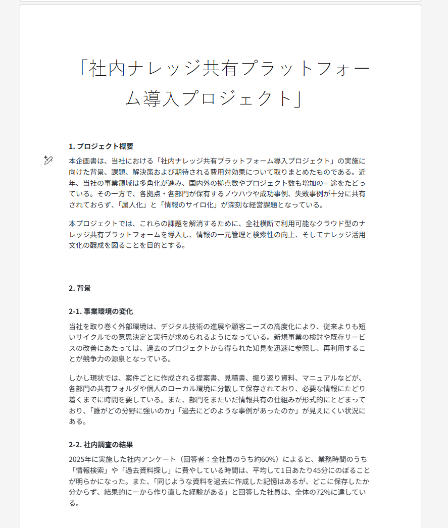 【検証2】Wordの企画書をスライド化 プレゼン資料を作成する際、いきなりスライドに向かうのではなく、まずはWordなどで構成案や台本となる企画書を文章で作成することは少なくありません。 ここでは、そのWord文書をCopilotがプレゼン資料に変換できるかを検証します。