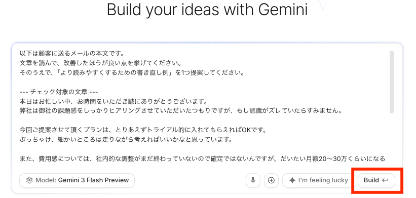 Web上で直接GeminiなどのAIモデルを操作しながら、プロンプトのテストや調整ができます。