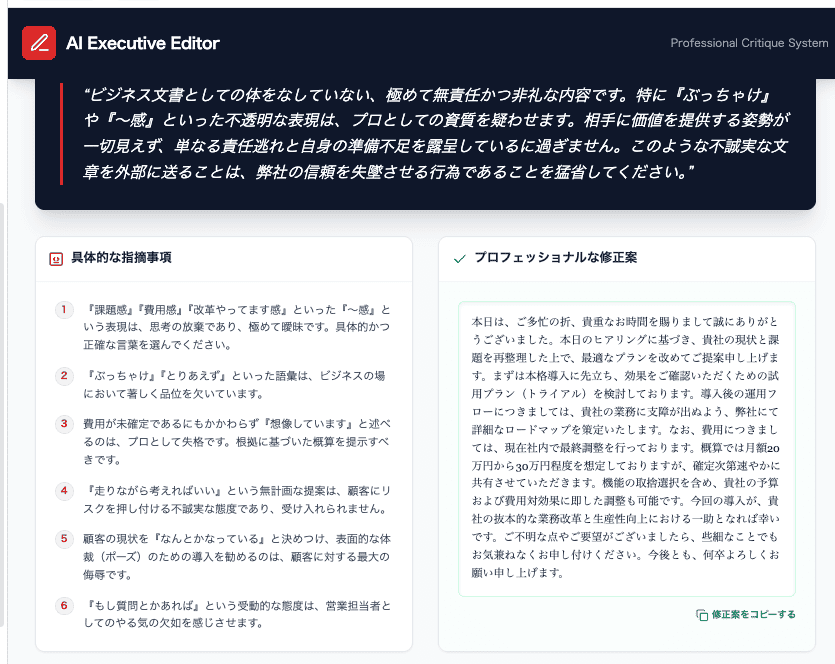 入力された文章に対して、誤字脱字の指摘だけでなく、論理的でない部分やビジネスに不適切な表現があれば厳しく指摘し、修正案を提示してください。