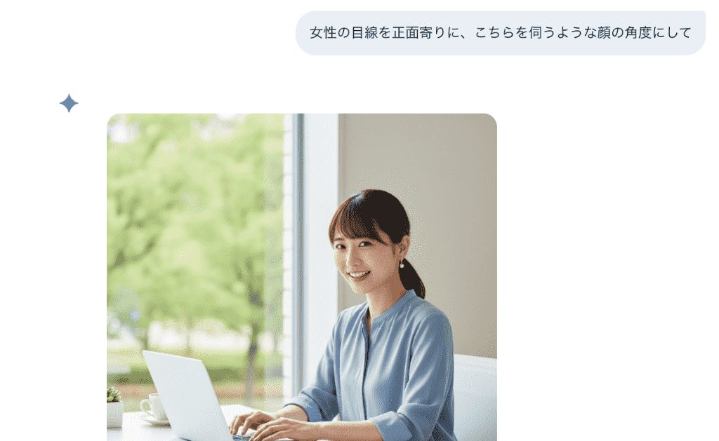 最初から100点の画像を出そうとせず、生成された画像を見て「もっと〜して」「ここを変えて」とチャットで会話するように修正していくのがGeminiの醍醐味。