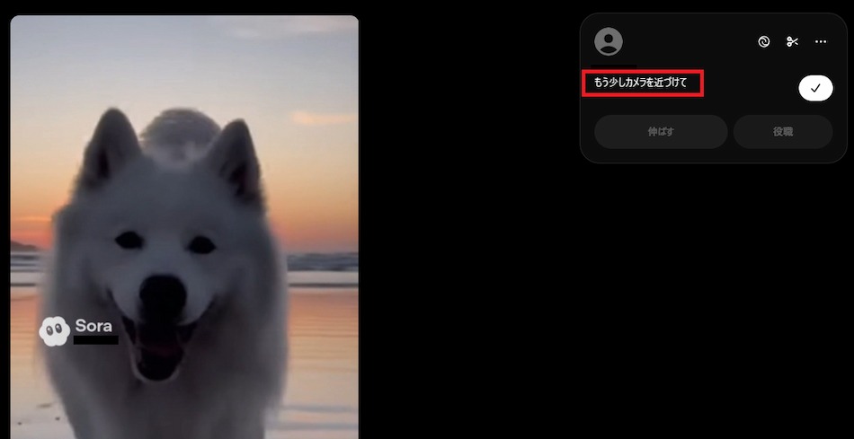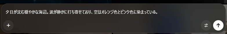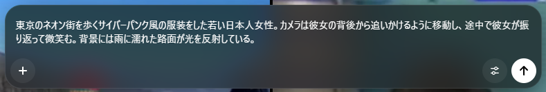 まず、入力欄に「どのような動画を作りたいか」を日本語で打ち込みます。 例えば「夕暮れの海辺を走る白い犬」といった具体的な情景を伝えることで、生成が開始されます。