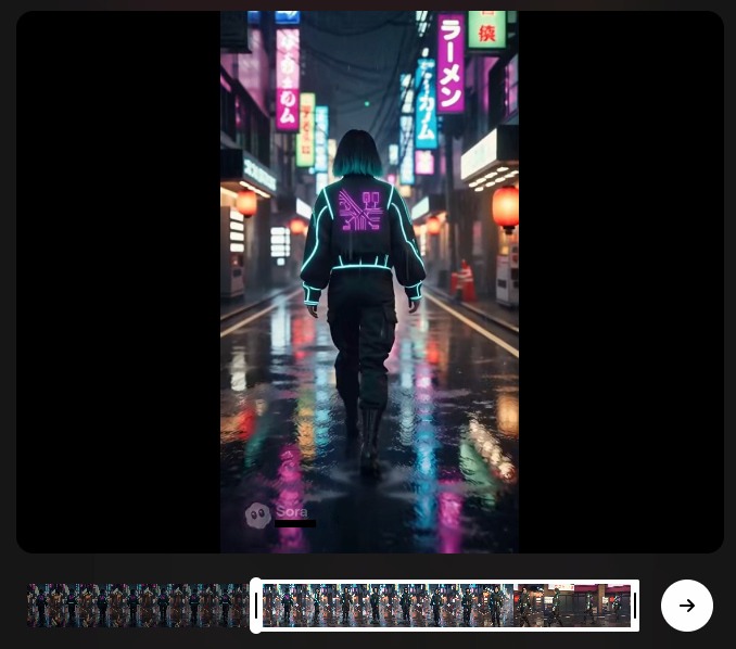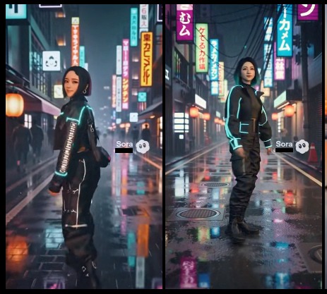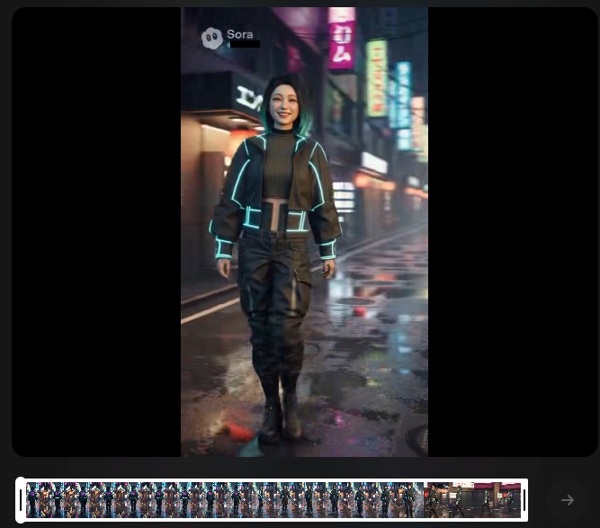 「東京のネオン街を歩くサイバーパンク風の服装をした若い日本人女性。カメラは彼女の背後から追いかけるように移動し、途中で彼女が振り返って微笑む。背景には雨に濡れた路面が光を反射している。」 【プロンプト(英語)】
