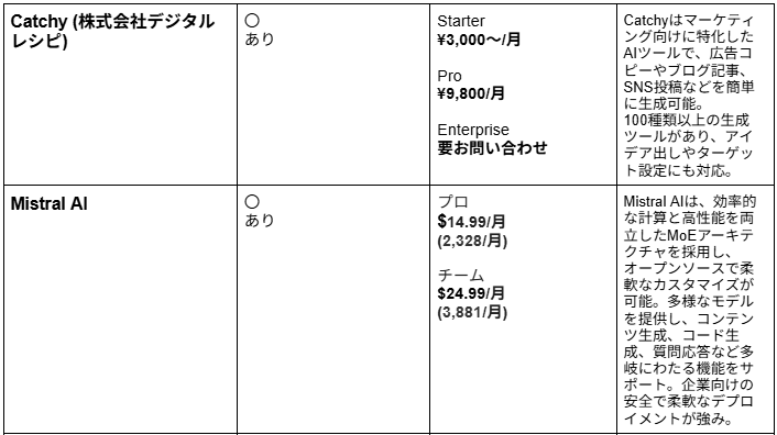Mistral AI/GPT/Claudeは、ブログや広告コピー等の文章生成に加え、要約・リライト・翻訳、企画の見出し案やLP構成作成、資料統合や比較表などの情報整理、要件からのコード提案とテスト生成、CSV/ログ整形や正規表現作成、カスタマー対応の定型返信、そしてJSONやMarkdownなど指示どおりの厳密フォーマット出力まで幅広く対応することができます。