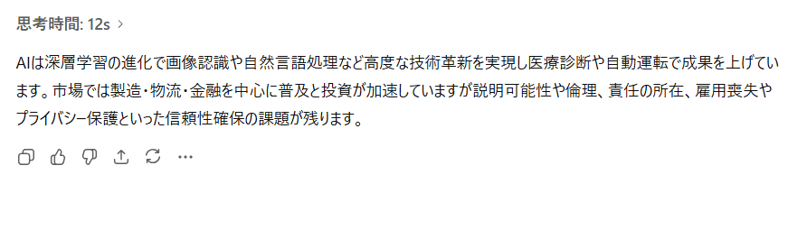 ChatGPT: 論理的なフローがしっかりと構築されており、技術革新、市場動向、今後の課題がバランスよく盛り込まれていました。要約は非常にシンプルで、重要な情報が漏れずに整理されています。全体的にバランスが良いと感じました。