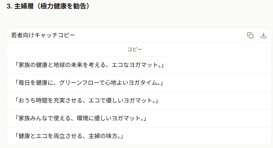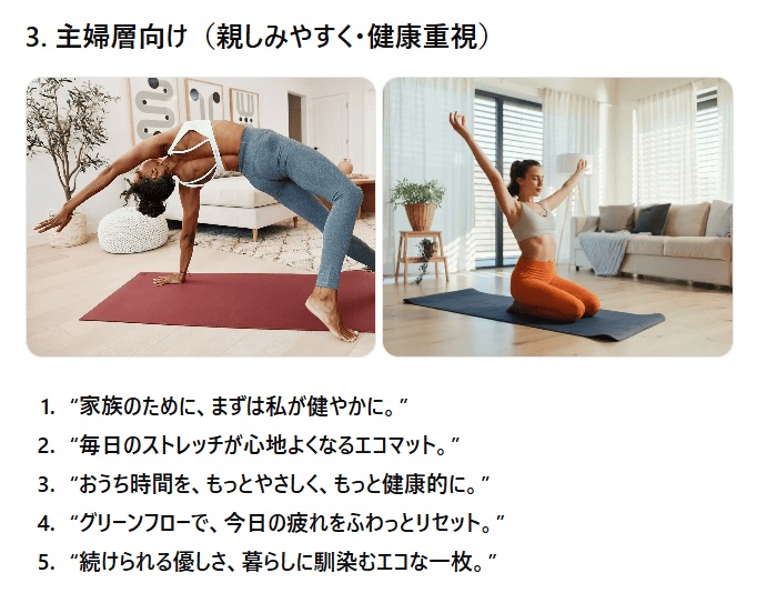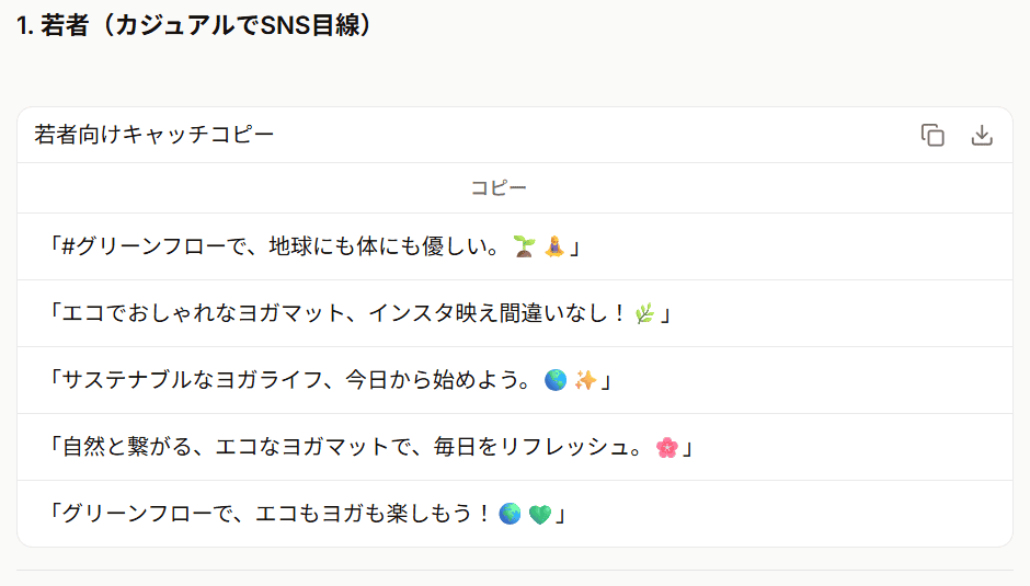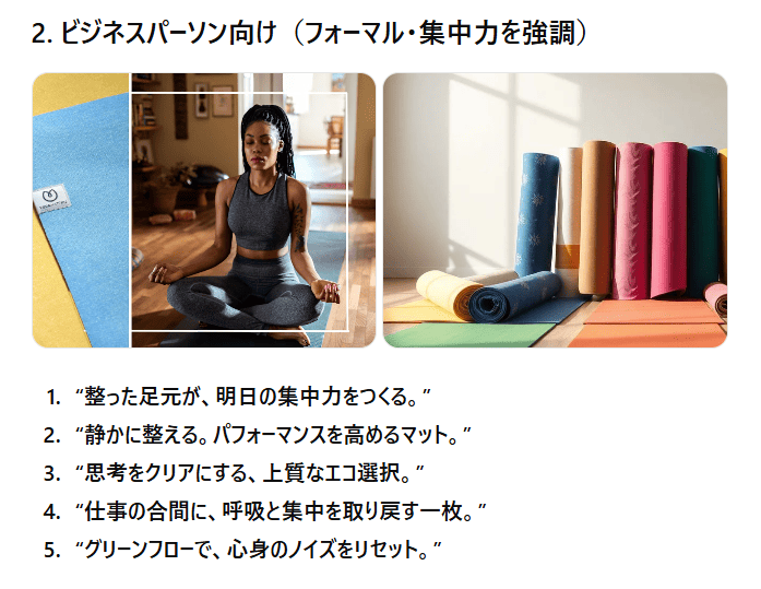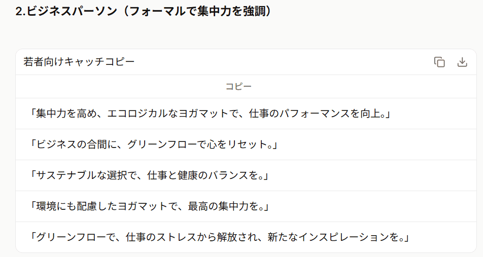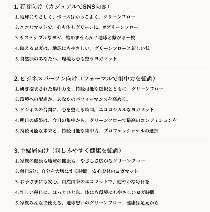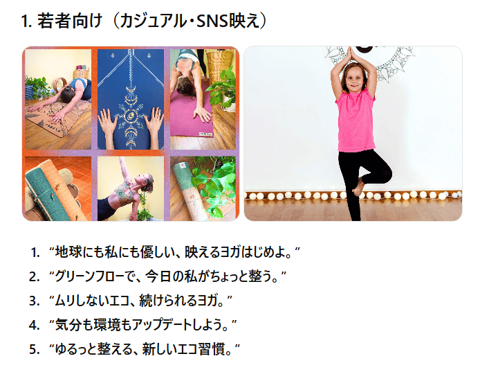 若者向け、ビジネスパーソン向け、主婦層向けそれぞれの文体が適切に調整されており、ターゲットに対するアプローチが一貫しています。例えば、若者向けのカジュアルなコピーはSNSにぴったりで、親しみやすい言葉遣いが印象的でした。「地球にも私にも優しい、映えるヨガはじめよ。」といったフレーズは、SNS映えしそうで、即座に使えるデザイン案が浮かびます。