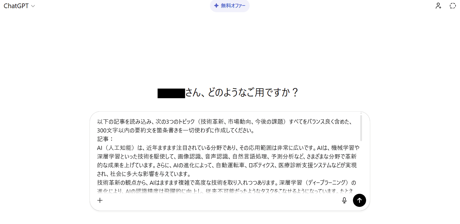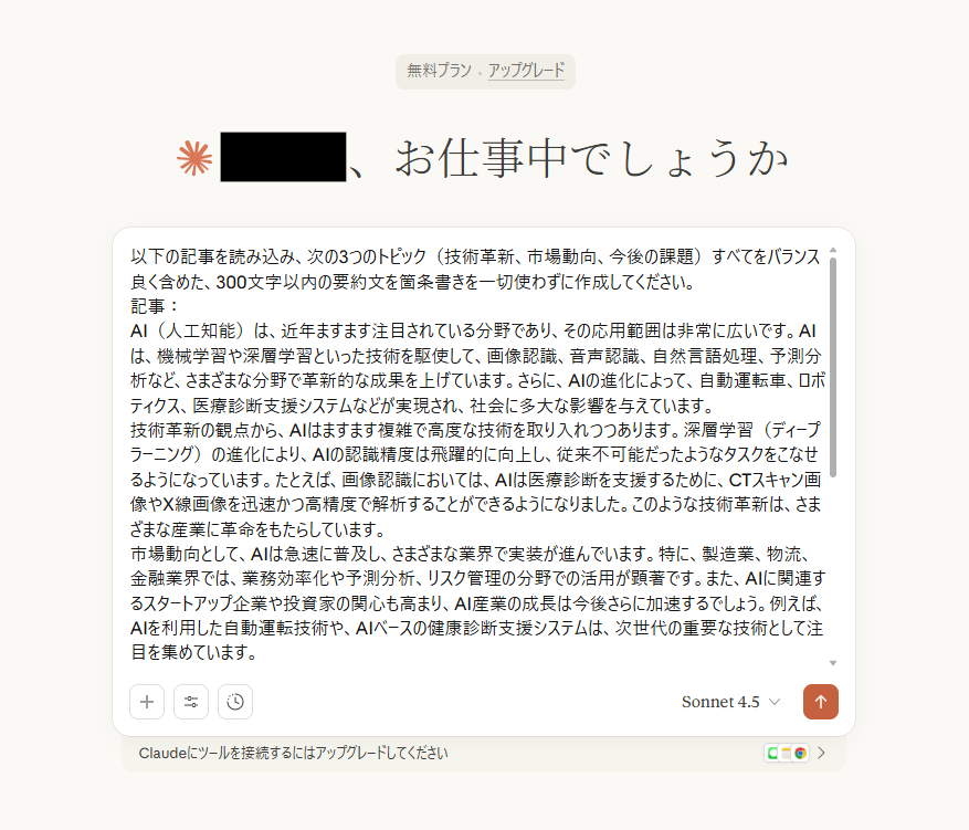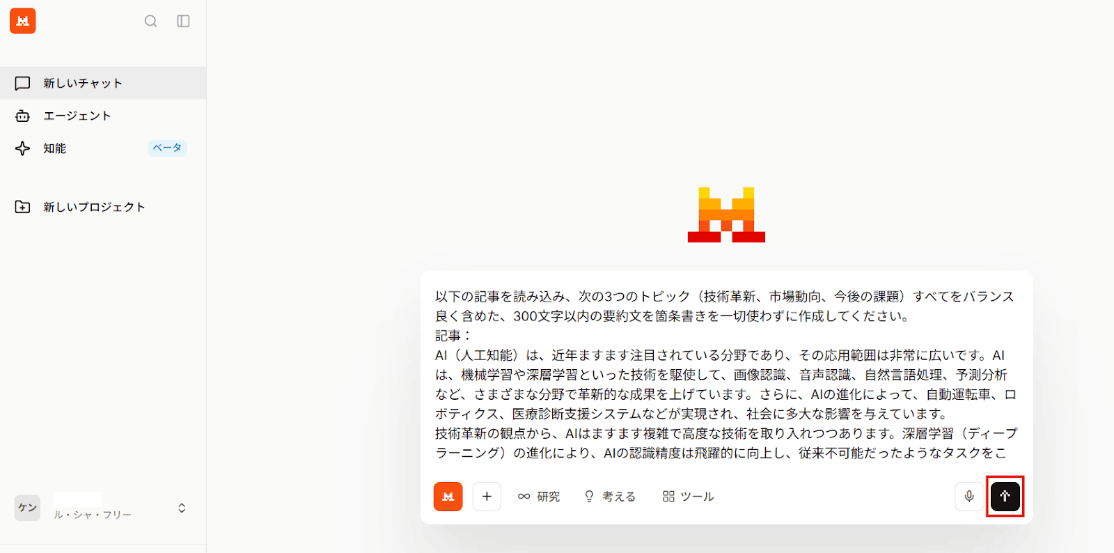 検証①と同様にログイン後、表示された画面でプロンプトを入力したら送信します。