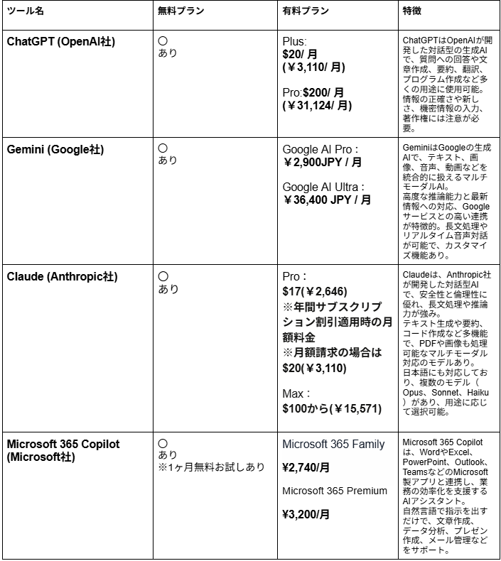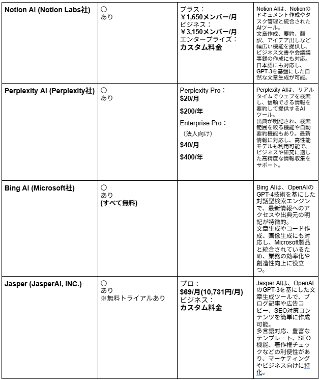 ChatGPT料金サイト/Gemini料金サイト/Claude料金サイト/Microsoft 365 Copilot料金サイト/Notion AI料金サイト/Bing AI料金サイト/Jasper料金サイト/Catchy料金サイト/Mistral AI料金サイト