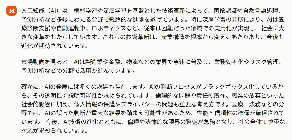 Mistral AI: 技術革新、市場動向、今後の課題を適切に含んでいますが、要約であるはずが比較的長めの文が生成されました。若干表現が平易すぎることがあり、深みが不足している印象を受けました。