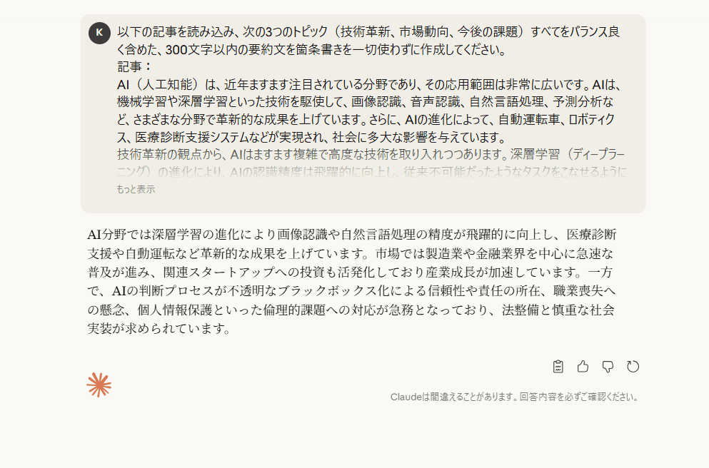Claude: 非常にバランスの取れた要約が生成されました。技術革新、市場動向、今後の課題がどれも均等に扱われ、特に「今後の課題」に関しても深く掘り下げて説明していました。