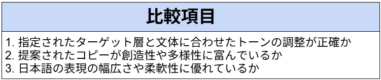 Claude: 日本語表現の幅広さに関しては非常に優れており、若者向けではおしゃれでカジュアル、ビジネスパーソン向けでは洗練されたフォーマルな言い回しを使い分けています。また、主婦層向けの表現も優しく、生活感を感じさせる言葉選びが適切で柔軟性もありました。
