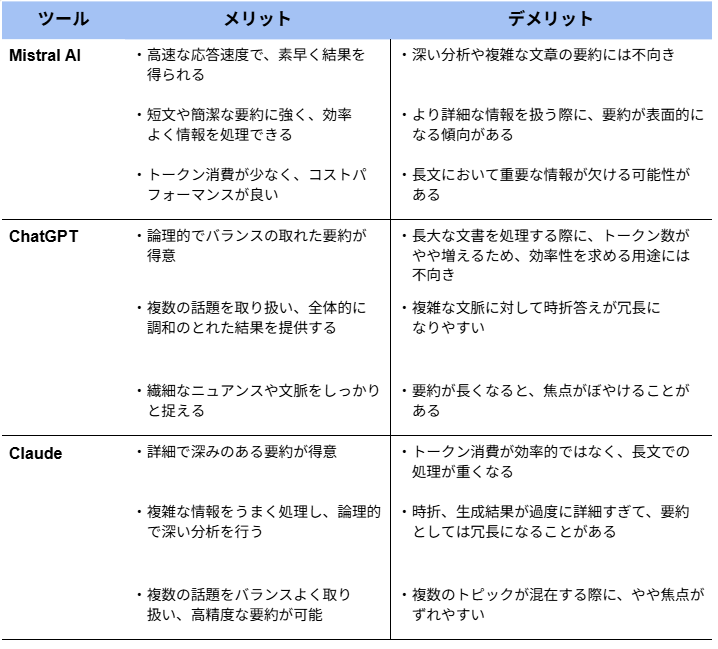 同じプロンプトでMistral AI・ChatGPT・Claudeにて要約を実行。