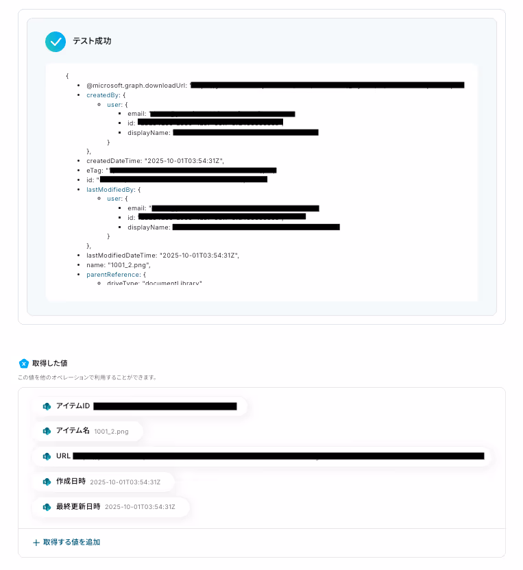 テストが成功すると、以下のように「取得した値」が表示されます。この「取得した値」は、後のフローで使用します。