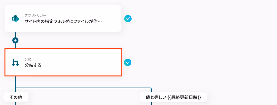 なお、今回は作成日時と最終更新日時が等しい=ファイルが作成された場合にのみフローを進めるという条件で分岐をさせます。