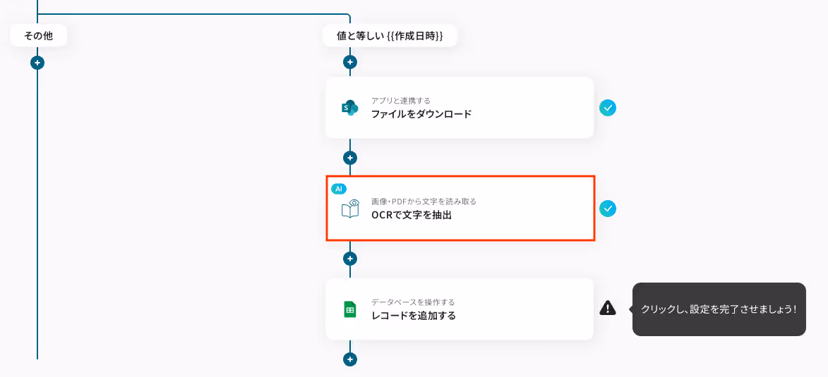 例えば、メールやフォームで受け取ったPDFや名刺画像を自動で読み取り、データベースやクラウドストレージに格納するフローを構築可能です。
