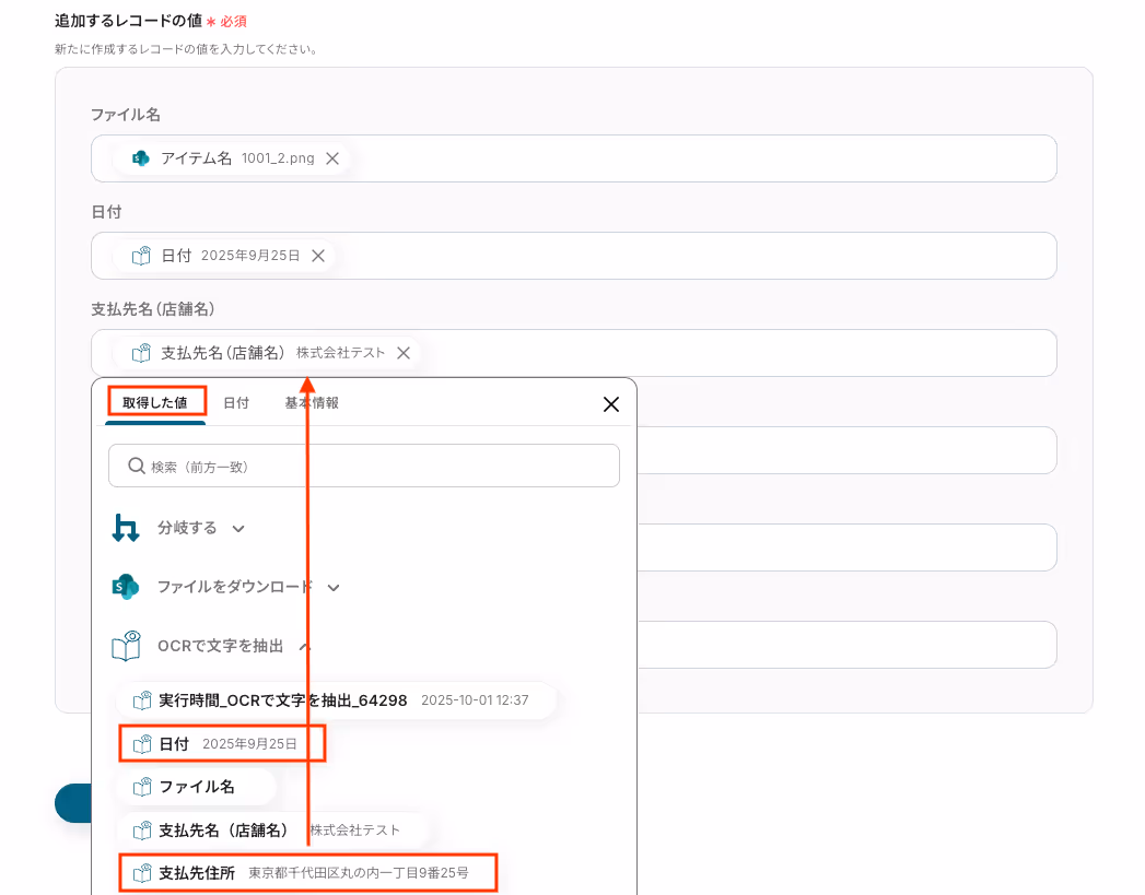 以下を参考に、Google スプレッドシートに追加する内容を取得した値から選択します。なお、ここで表示されている各ボックスの項目名は、用意したGoogle スプレッドシートに基づいています。